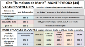 - Taxe de séjour en sus (perçue pour le compte de la communauté de communes de la vallée de l’Hérault) : 1,30 € par adulte et par jour (gratuit pour les moins de 18 ans)